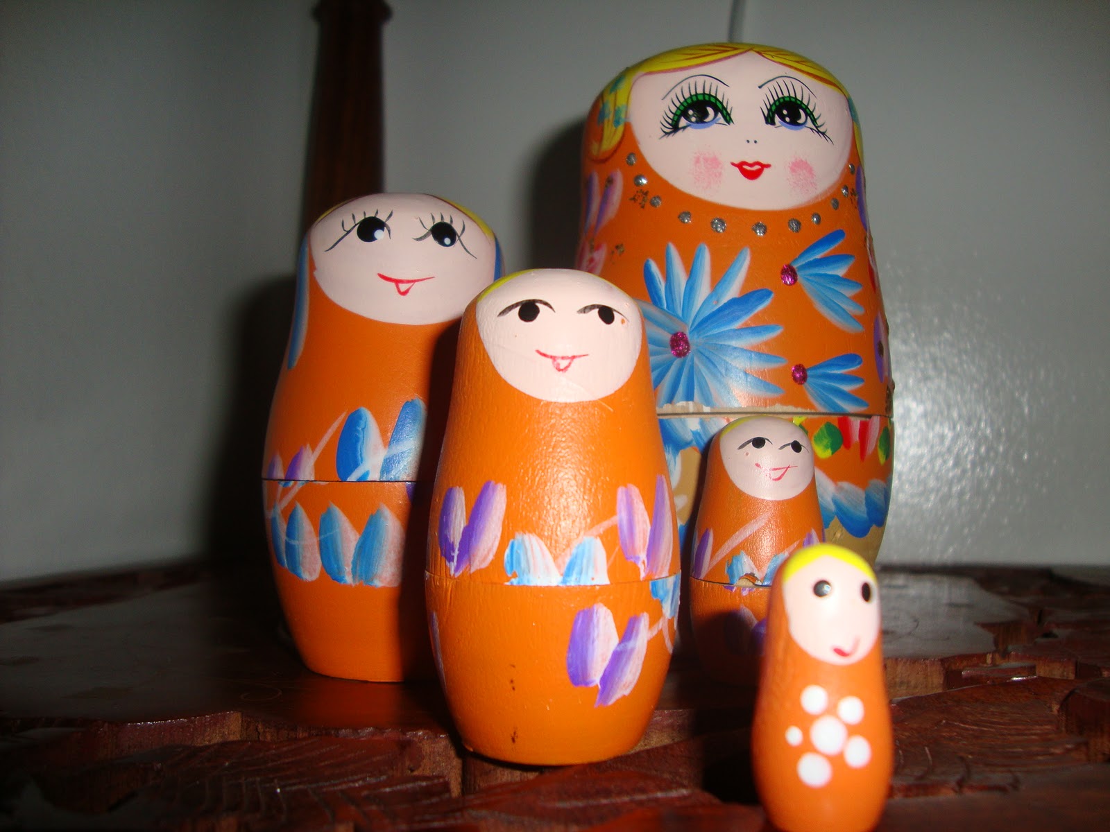 Matrioska é um brinquedo tradicional da Rússia, constituído por uma série de bonecas, feitas de diversos materiais. As minhas são de madeira. Elas são colocadas umas dentro das outras, da maior até a menor (a única que não é oca). O número de bonecas é variável. As minhas são compostas de 5 e 6 figuras para encaixar. Existem ainda algumas com um número impressionante de peças.