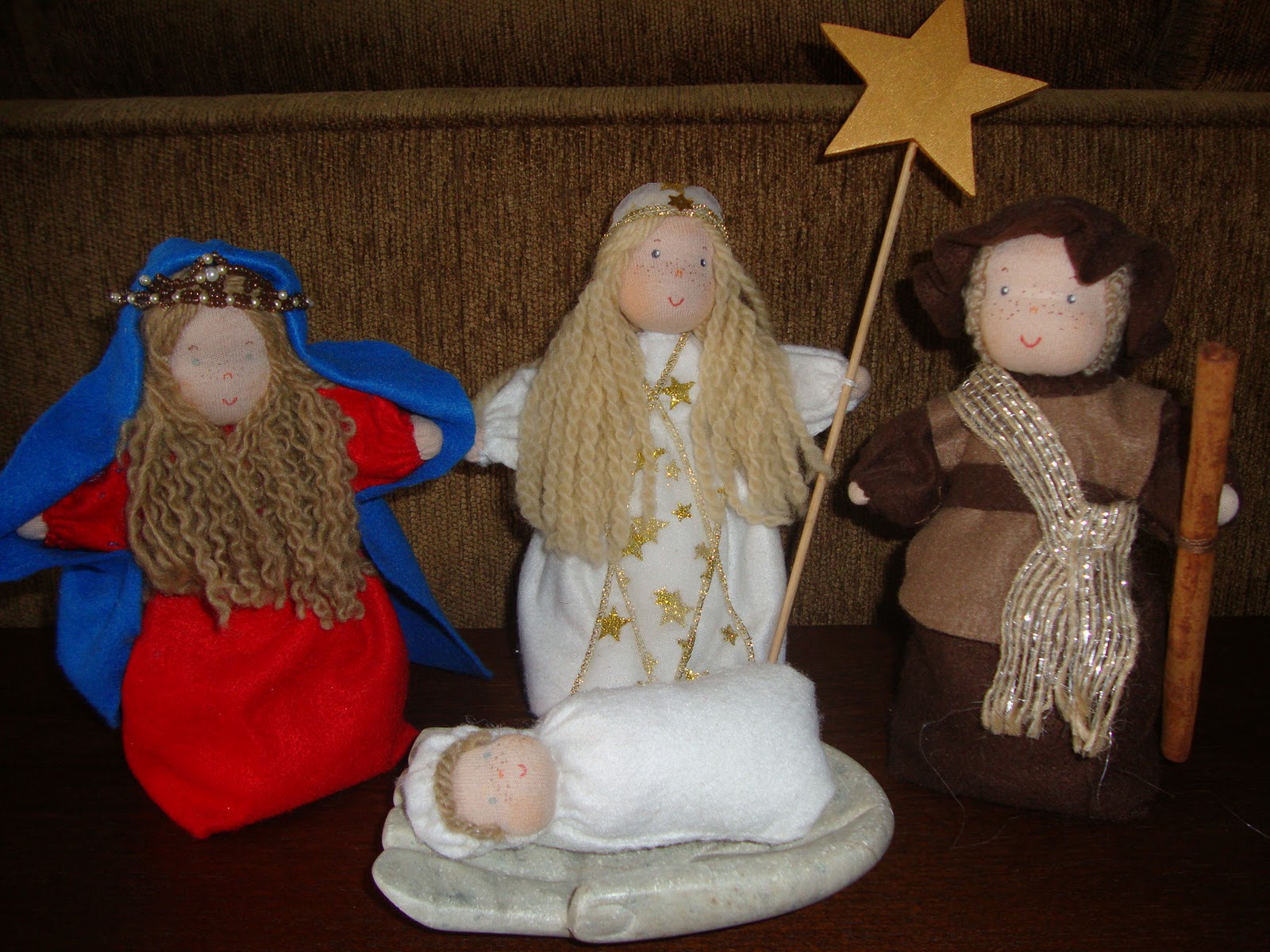 Amigos, este é meu presépio mais especial! Eu fiz a Maria e o Menino Jesus, e ganhei José e o Anjo da minha querida mestra alemã, Evelyn Scheven, uma sumidade da antroposofia mundial.